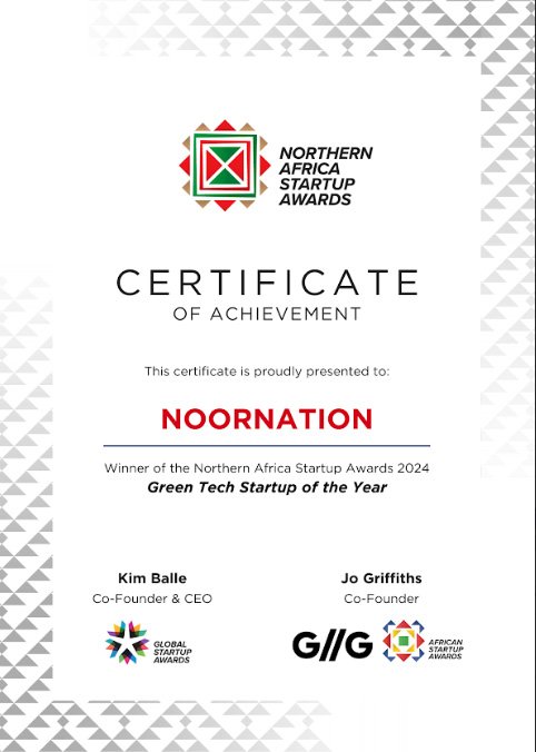 NoorNation won the 2024 title of “Green Tech Startup of the Year” by the Global Startup Award, Northern Africa. This recognition highlights the company's significant contributions to advancing sustainability and promoting environmental responsibility in the agricultural and economic sectors.